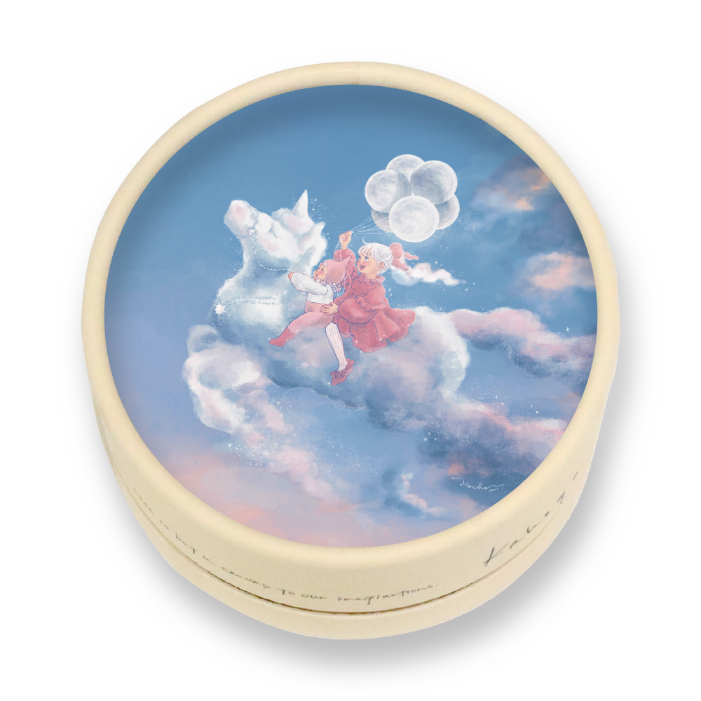 月を束ね、雲のユニコーンで空をかけるこどもたち。小さなきらめきの中には、いくつかのラッキーチャームがかくれています。明るい未来へ向かう「お守り」になりますように。
