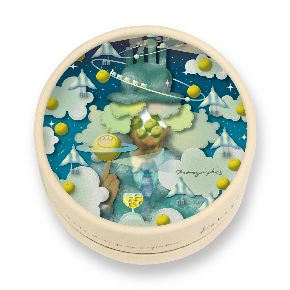 パッケージの丸いキャンバスは、作家としても遊び心が自然とあふれてくるかたちです。今回は私にとって珍しく、フルCGでの制作に挑戦しました。どこか懐かしさを感じる温かみのある質感を大切にしながら、Macで丁寧に仕上げています。