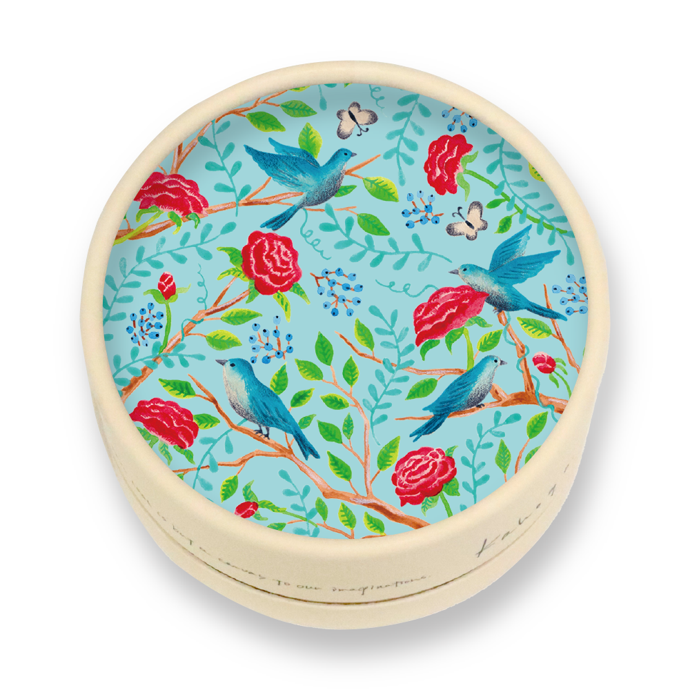 円形の構図に、石鹸を囲むように枝葉と鳥を巡らせ、手に取った瞬間に“包まれている感覚”が伝わるデザインにしています。