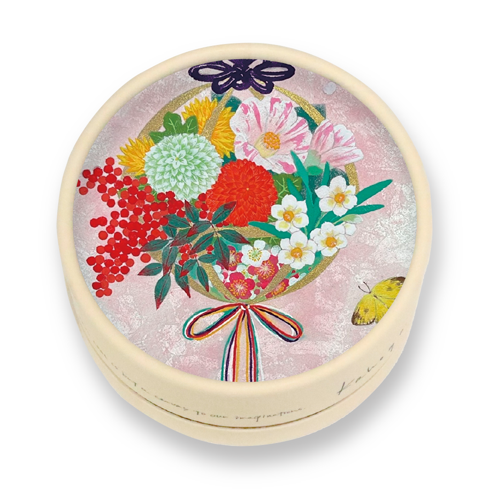 「くす玉」は古くは薬草や香草を袋に詰め、菖蒲などの草花を飾りに添え五色の色をたらしたもの。「薬玉」と書いて無病息災を願う飾りでした。kahogoの透明枠練り石鹸の健康を願う気持ちと、それを手にする皆様が希望と期待のこもった時を迎えられますよう縁起のよい新春の草花をつめて「久寿玉」を描きました。