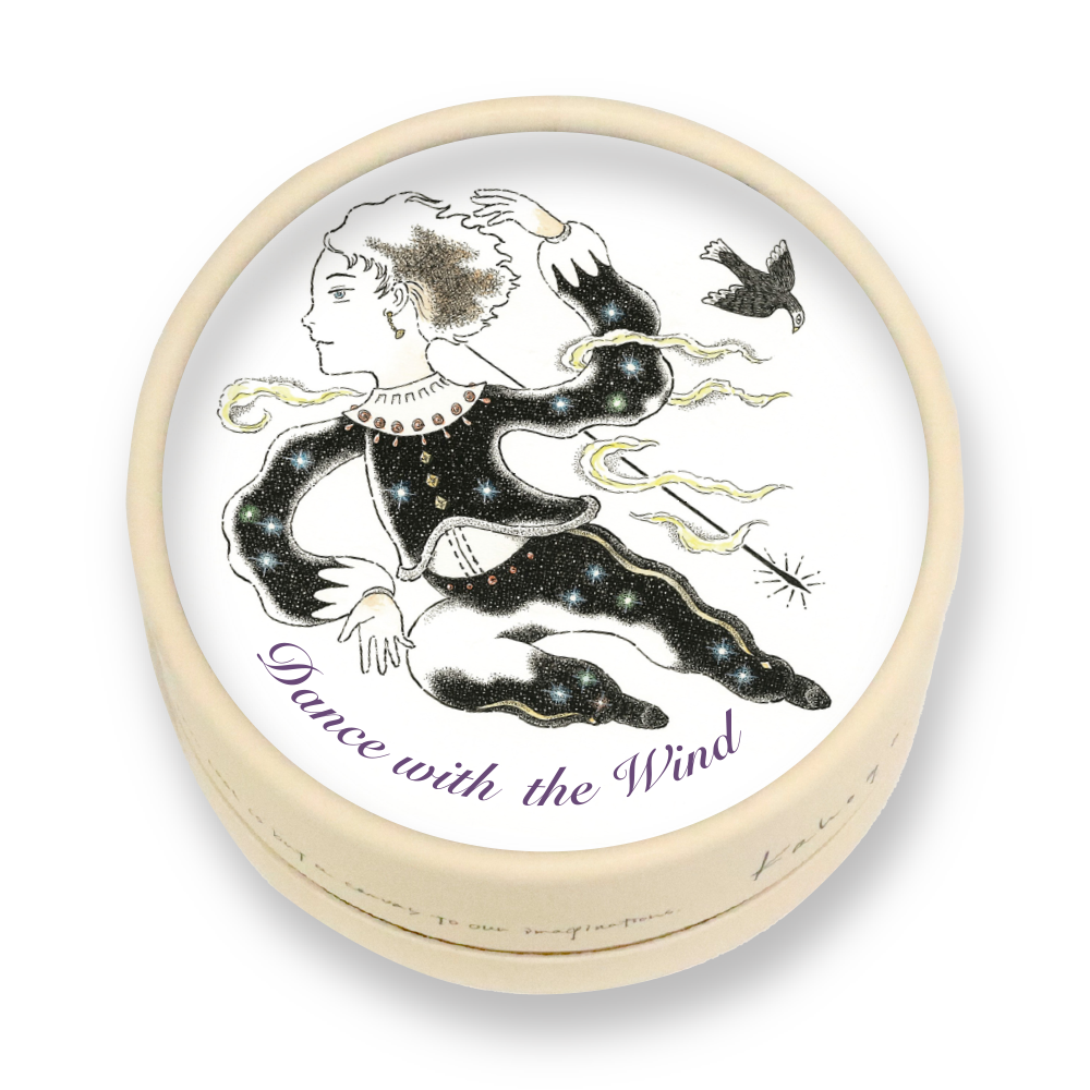 「風」と「踊り」をモチーフに、エレガントさと親しみやすさを兼ね備えた絵になればと思いながら描きました。星の衣装をまとって踊るこの人物が人間なのか、風の精なのか、特に決めていません。デッサンがピシッと決まった絵に惹かれるのですが、この作品はあえてラフさを残すように描いてみました。